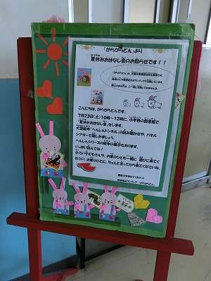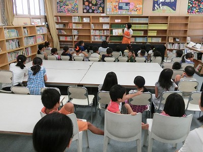 「がらがらどん」による『夏休みおはなし会』が10時から図書室でありました。また、今日は「東淀川区絵本読み聞かせ事業」よりもお手伝いに来てくださりました。