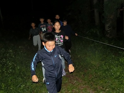 林の中に作られた遊歩道の入り口まで移動し、班ごとに真っ暗な夜の林の中に入っていきます。頼れるのは、コースの案内の左手に持つ1本のロープだけです。