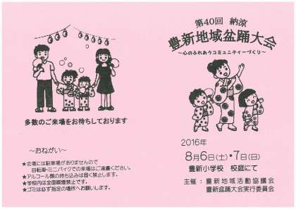 今週末の8月6日(土)・7日(日)は、本校グランドにて、「第40回 納涼 豊新地域盆踊大会」が実施されます。