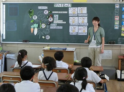 普段よく食べている野菜、給食でよく出てくる野菜、植物でいう、いったいどの部分(花、葉、実、くき、根)を食べているのかを学習しました。玉ねぎ、だいこん、にんじん、レタス、トマト、ほうれん草、ブロッコリー、じゃがいも、なす、アスパラガスなどです。