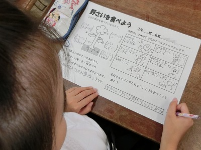 次に野菜の働きについて、2年生での学習の復習をし、最後に、3年生として1日に食べたい野菜の量が300gということを聞きました。給食ではだいたい100gほどらしいので、朝ご飯と夜ご飯であと200gの野菜を食べましょう。