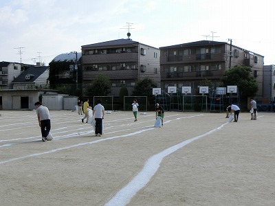 放課後に教職員が総出で、運動場に「にがり(塩化マグネシウム)」をまく作業をしました。