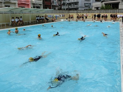 今日は最後の学習ともあって、小学校で学んできた「水慣れ」の動きを一通り行った後、25mを自由な泳法で1本泳ぎました。そのあとは、「宝探し」に「自由時間」と、先生方から「ご褒美」をたくさんもらいました。存分に楽しめたことでしょう。