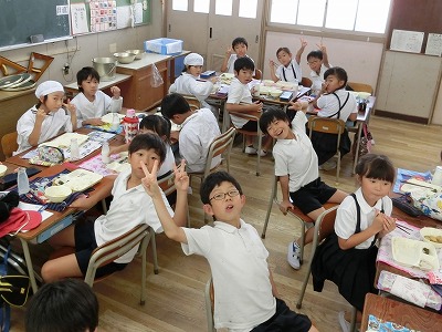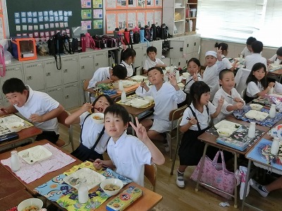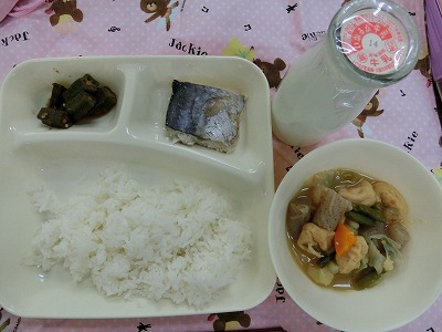 さごし(さわらの幼魚)の塩焼きは、ふっくら、あさりした身でおいしかったです。。中骨も一部の身に残っていましたが、低学年さんもお箸を使ってうまく取り除いて食べていました。