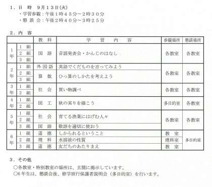 9月13日(火)には、2学期に入って初めての学習参観ならびに懇談会を実施いたします。また、6年生は修学旅行の説明会も実施されます。