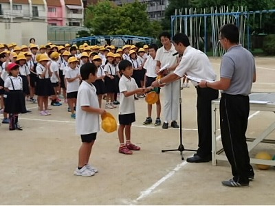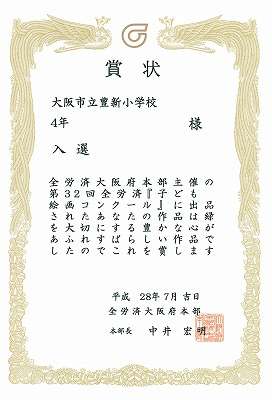 今朝の全校朝礼では、「第32回 全労災『子ども絵画コンクール』に出展し、賞をいただいた24名の児童に賞状の伝達を行いました。