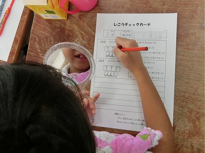 歯みがき終わった後に、もう1度染め薬を塗って、正しく磨けたか確かめました。