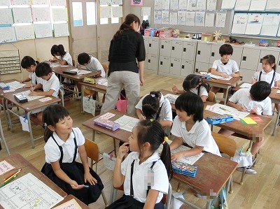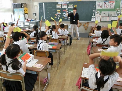 栄養士さんに来ていただいて、1・2組は2時間目に、3組は3時間目に学習をしました。
