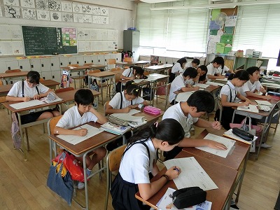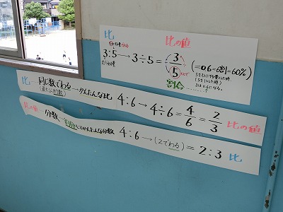今、「割合の表し方を考えよう」という単元で「比」や「比の値」について学習しています。この単元では、クラスを2分割にして、少人数で学習を進めています。