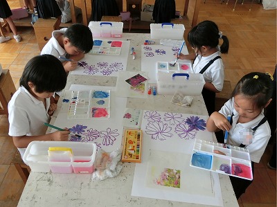 次いで、パレットに赤と青の絵の具を出し、赤と青を使って混色し、いくつかの色合いを作り出して花弁に塗る作業をしました。