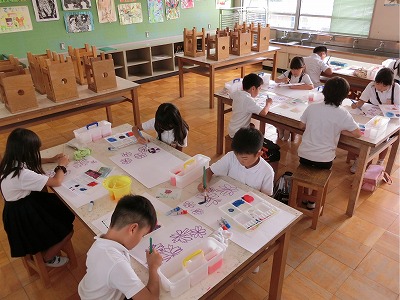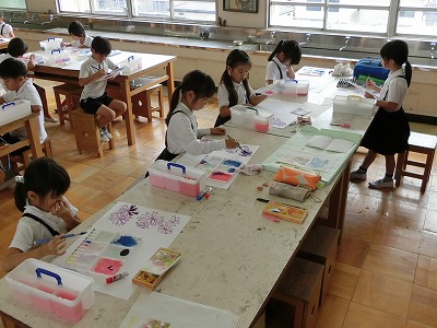 2年生では、9月に入って黄、赤、青の3色の絵の具を使って混色の学習をしてきました。