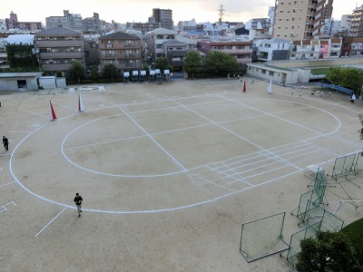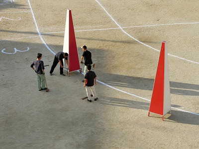 それに向けて、今日の放課後、先生方、事務員さん、管理作業員さんで入退場門の設営、本部や準備用具用のテントの骨組み、コースラインの引き直し、児童席の場所割りなどを行いました。
