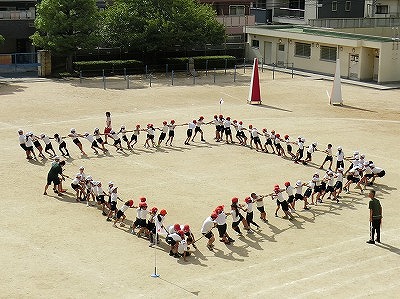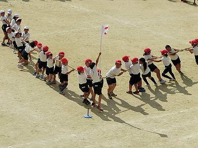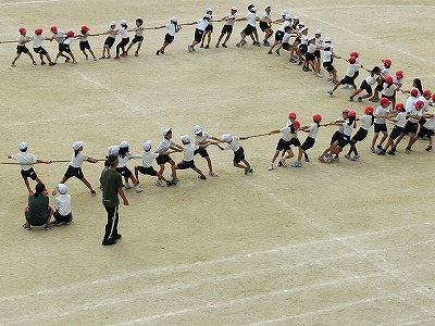 皆さんがご存知の1本の綱を、赤組と白組で反対方向に引き合うのではなく、綱がグランドの中央に四角に配置されていました。