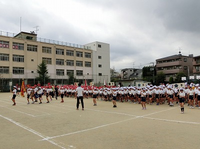 昨夜の雨で運動場はかなりぬかるんでいましたが、先生方が朝早くから整備を行い、1時間目を利用して、2回目の全体練習を行いました。