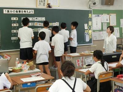 今日のテーマは「1食分の食事を考えよう」で、まずは、たくさんあるメニューの中から、各自で給食のメニューを組み合わせも考慮して考えました。