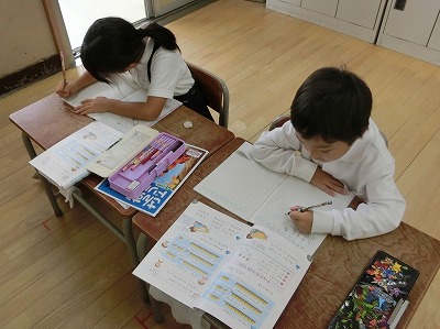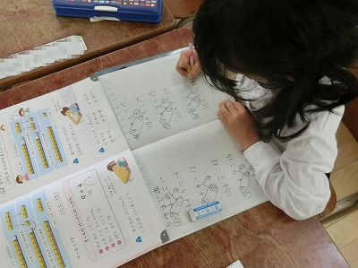 このクラスでは、1ケタ+1ケタのたし算を学習していますが、答えが10より大きくなる計算の仕方を学習していました。