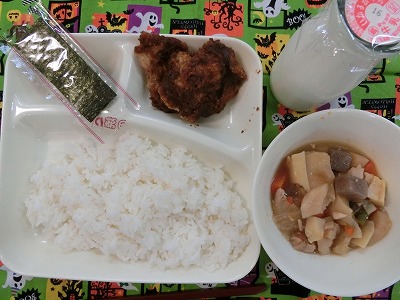 鶏肉と野菜の煮物は、鶏肉、こんにゃく、たけのこ、にんじん、れんこん、三度豆のお野菜がたっぷり入っていて、筑前煮のようでした。子どもたちもたくさんお野菜を食べてくれていました。