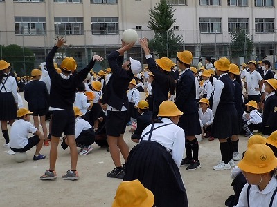 高学年は、低学年にボールを送ろうとするのですが、背の高さがだいぶ違うので、なかなかうまく送れない班もありました。どの班も、高学年の児童がやさしくボールを送ってあげたり、助けてあげたりしていました。