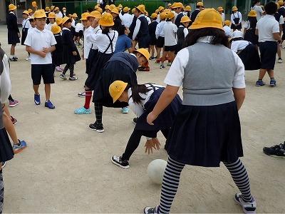 縦割り班の長い列を、前から後ろへボールを送るときは股を通し、後ろから前へボールを送るときは頭の上を通します。ボールが先頭に戻ったら全員が座ります。