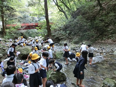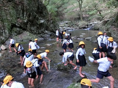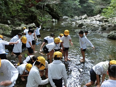 とっても冷たい川の水にびっくりです。滑って転んでパ・・まで濡れてしまった子もいましたが、子どもたちは大喜びで楽しんでいました。