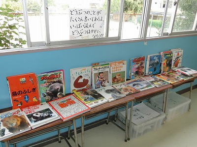 この単元をもとにして、いろいろな動物にも興味を持ってもらうために、2年生の廊下には大阪市立中央図書館から、たくさんの動物に関する本を借りてきました。