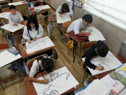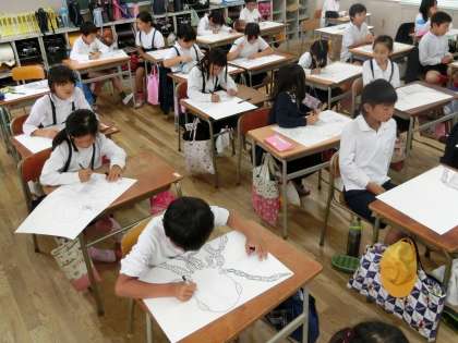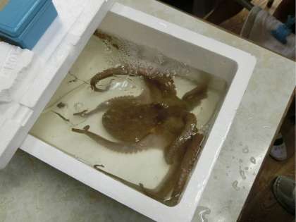 これは、4年生の図工の学習の様子で、タコの絵を描くのに、どうせなら、生きた本物のタコの方がと、4年生の先生方が工面して入手してきました。