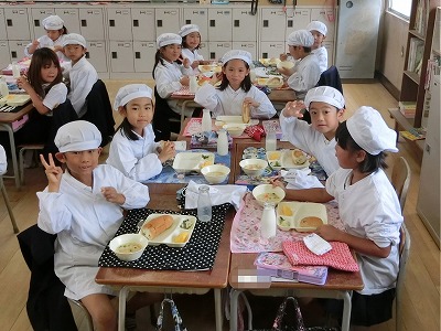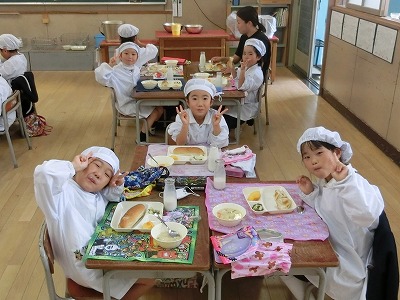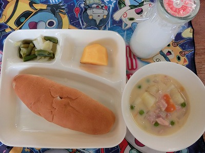 今日のコーンクリームシチューは、小麦粉ではなく、米粉を使って作られていました。コーンたっぷりはもちろんですが、鶏肉、ベーコン、ジャガイモ、玉ねぎ、にんじん、グリーンピースなどの具材もたっぷりでした。とってもおいしくて、すぐに食缶は空っぽです。パンに浸して食べている子もいました。