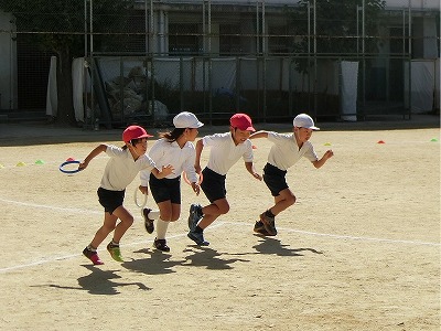 このクラスでは、クラスで4チームを作り、トラック1周のリレー競争をしていました。