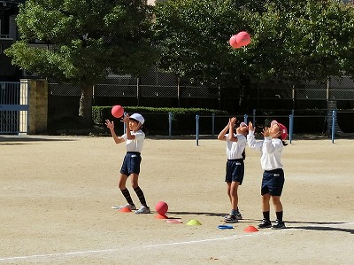 半周、走ったところで、ボールを取り、高く上に投げている間に、手のひらを2回たたくという動作をし、残り半周を走ってきて、次の子へバトンパスです。