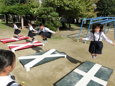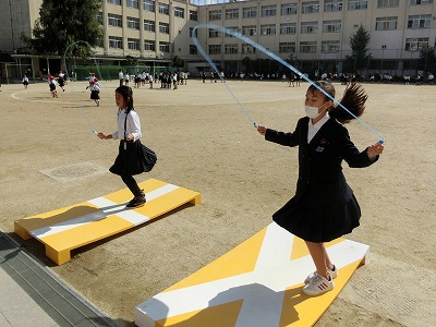 休み時間になると、子どもたちは真新しい「ジャンピングボード(縄跳び台)」へダッシュです。