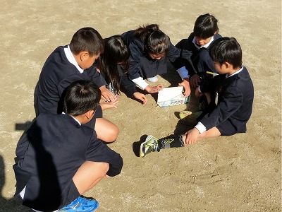 測定は9時と12時の2回、運動場に出て班で協力して観察をしていました。
