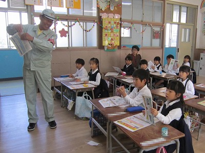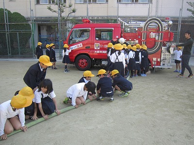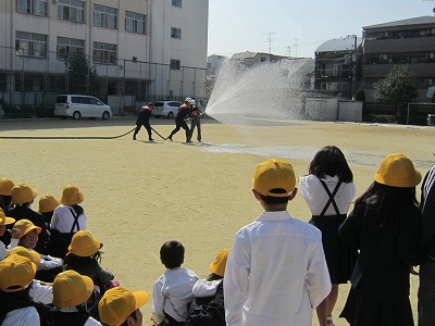 1・2年生は、2時間目は、地域の防災リーダーさんに手伝ってもらって、新聞紙を使った簡易スリッパづくりをしました。3時間目には、消防車がお運動場に登場です。消防隊の人からお話を聞いたり、放水も見ることができました。間近に消防車が見れて大興奮でです。
