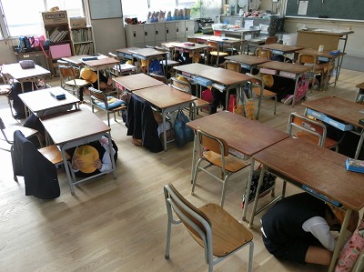 1時間目は、地震を想定した避難訓練からです。地震の発生とともに机の下に逃げ込み頭を守ります。ゆれが収まったという放送で運動場へ避難です。迅速な非難ができました。
