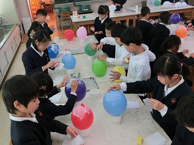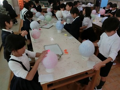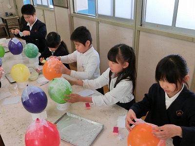 ふくらませたゴム風船に、まずは、水でしめらせた「半紙」を1通り貼りつけ、次に木工用ボンドを加え、2回目、3回目と貼り重ねていきます。最後の4回目は「和紙」をていねいに貼り重ねて、今日のところは作業が完成です。