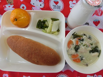 きのこのクリームシチューは、エリンギとしめじが入っていました。他に鶏肉、じゃがいも、たまねぎ、ほうれん草です。あったかくて、とてもおいしかったです。恒例のように、ライ麦パンをちぎってシチューにつけて食べている子もいました。