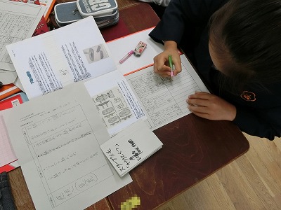 子どもたちの手には、スクープメモがあり、これまでに取材をしたネタが書き込まれています。ワークシートの記事の構成メモも参考にして、「和」に2人、「洋」に2人と分かれて、記事の作成、見出しの作成を行っていました。