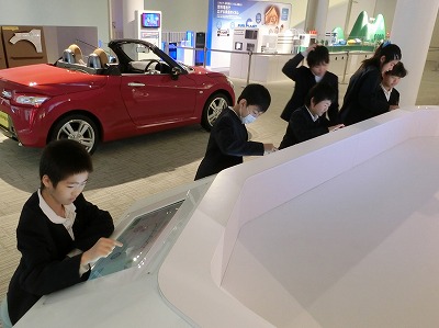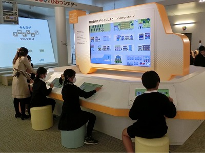 子どもたちは思い思いのデザインを行い、出来上がった自分のクルマが、前面の大型スクリーンに投影されると、大喜びでした。