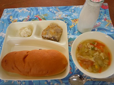 マカロニと野菜のスープ煮は、ベーコン、玉ねぎ、キャベツ、ニンジン、グリーンピース、コーン、セロリ、アルファベットの形をしたマカロニをチキンスープで煮込んでいました。嬉しそうにどんなアルファベットが入っているかを探していました。
