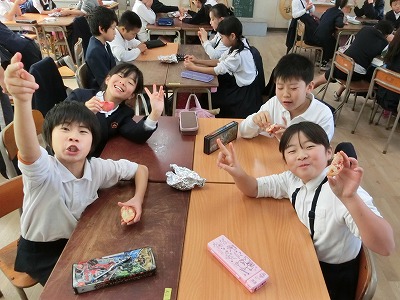 先日に管理作業員さんに収穫ていただいた「ザクロ」を、4年生は3時間目にいただきました。