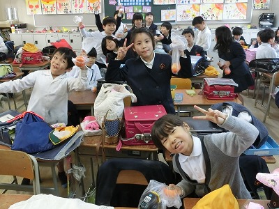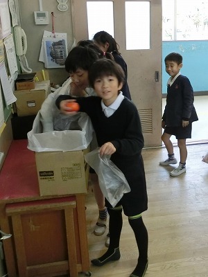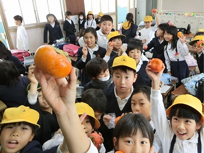 6時間の授業が終わって、終わりの会。先ほど収穫した「柿」を教室へと運びました。