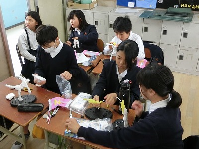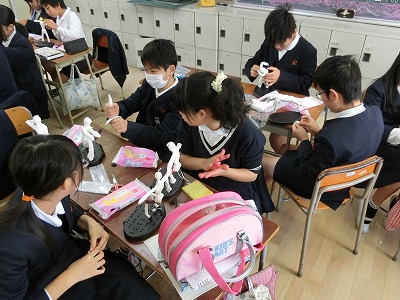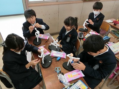 競技をしている選手の様子を、針金(ラジオペンチで曲げていく)と芯材を使って骨格を表現し、その上に紙粘土で肉付けをしていきます。絵具を紙粘土に少量混ぜ込んで色も付けていきます。