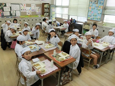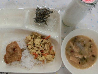 なめこのみそ汁ですが、いろいろなキノコは給食で扱われていますが、「なめこ」は昨年度が初登場の食材です。なめこたっぷりに、うすあげ、白菜、青ネギが入っていました。