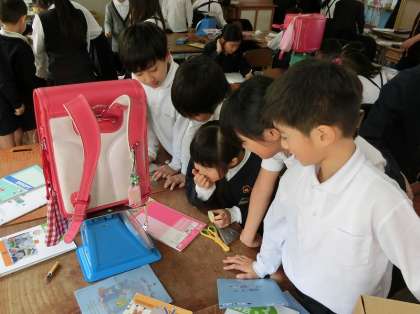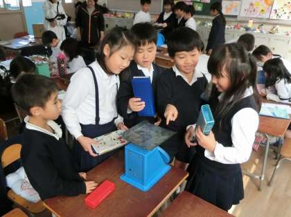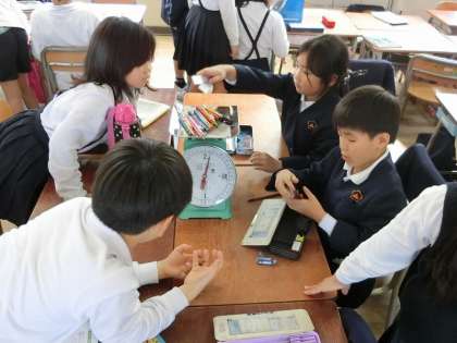 子どもたちは先生から、はかりを使う時の注意を聞いた後、鉛筆や消しゴムの重さを測ったり、筆箱、ランドセルの重さを、楽しそうに測っていました。