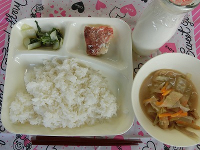 赤魚のしょう油だれかけは、白身のふっくらしたお魚の身に、しょう油とみりんと酒のたれがうまくあっていました。ほとんどの子で骨もなく食べやすかったです。