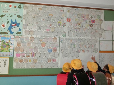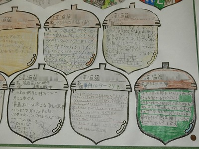 子どもたちが、自分の読んだ本についての感想や紹介を、どんぐり型のイラストの中に書いていき、貼っていきます。高学年さんは、うまく本の内容をあらすじにまとめて紹介してくれています。