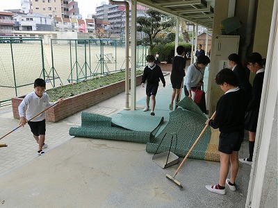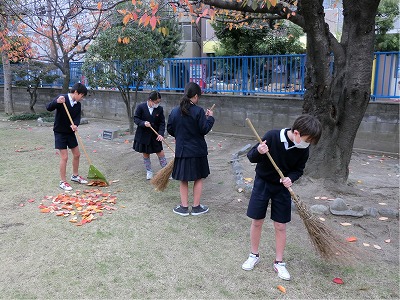 今日は1組さんが、班ごとに美化活動を行いました。給食室前や手洗い場の掃除、正門付近や芝生広場の落ち葉集め、校舎周りの落ち葉やゴミ集め、正門から道路沿いの街路樹の下のゴミ集めを行いました。
