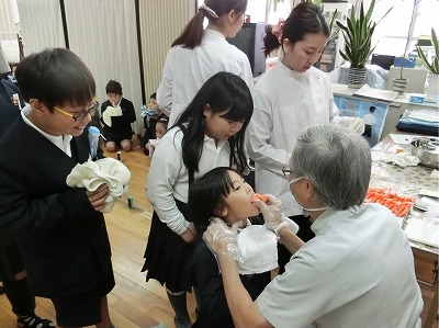 泡状のフッ化物が塗られたシリコンの歯型容器を、校医先生に大きな口を開けて入れてもらいます。