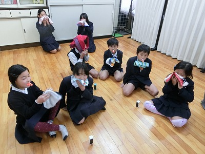 入れた後は、砂時計の砂が落ち切るまで3分間、子どもたちは何とも変な感覚で、じっと我慢していました。だ液がこぼれないようにタオルで受けながら、かなり長く感じられた3分でした。