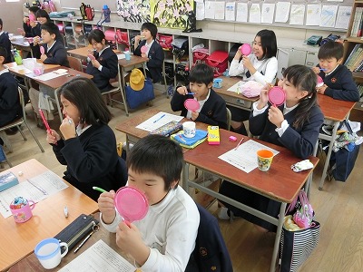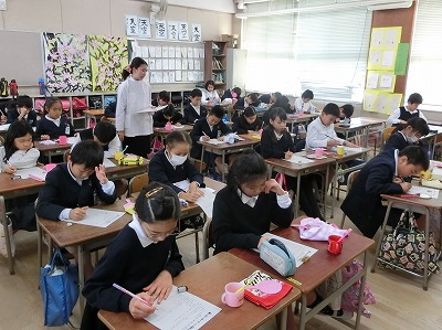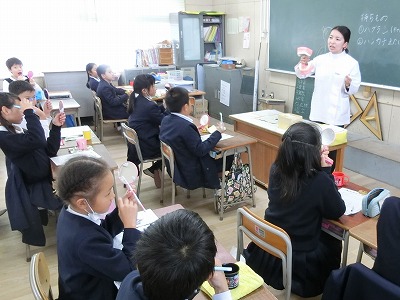 サンスターより歯科衛生士さんに来ていただき、まずは教室で歯についての学習です。