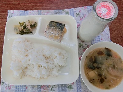さばのみぞれがけは、塩で下味を付けたさばを焼き上げ、大根おろしにみりん、しょう油、ゆずを加えた物をかけてありました。ゆずの香りも良く、さっぱりといただけました。また、今日は細い中骨がありましたが、低学年さんもていねいに骨を取り除いて食べることができていました。